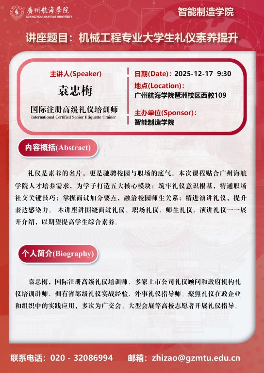 学术讲座预告:袁忠梅《机械工程专业老员工礼仪素养提升》